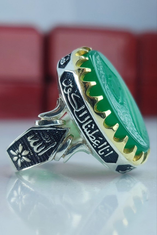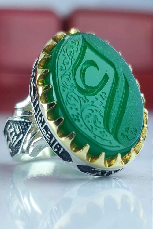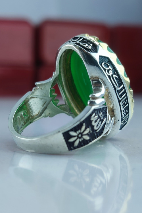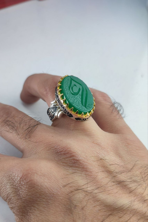Men's silver ring with green agate and engraving of Ali (AS)