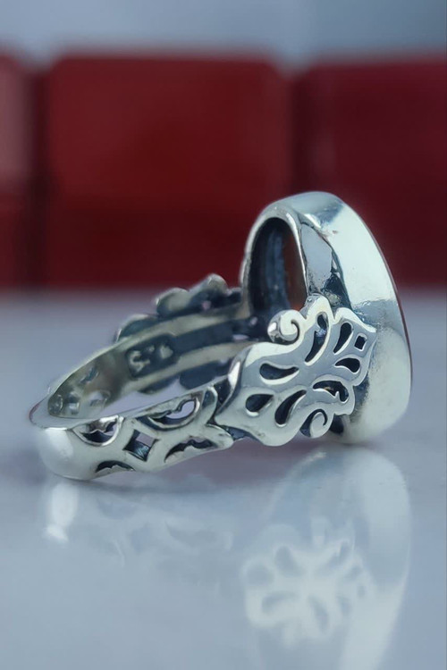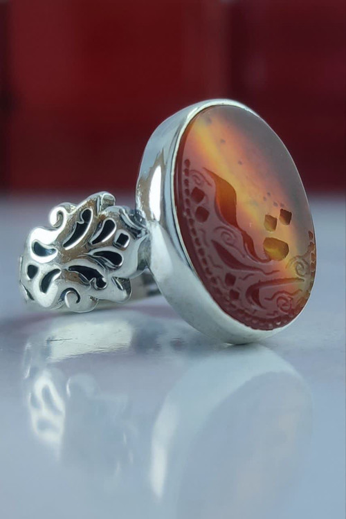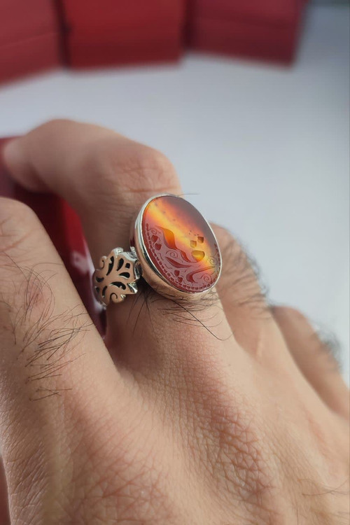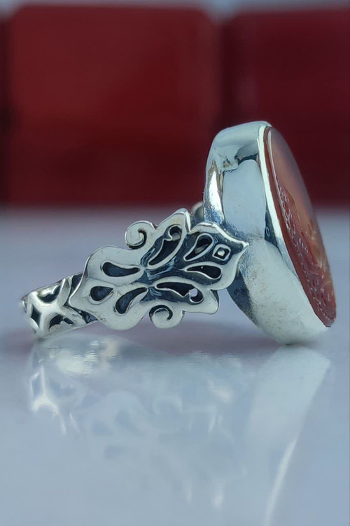 Men's silver ring with two-tone red agate and engraving or ruqyah