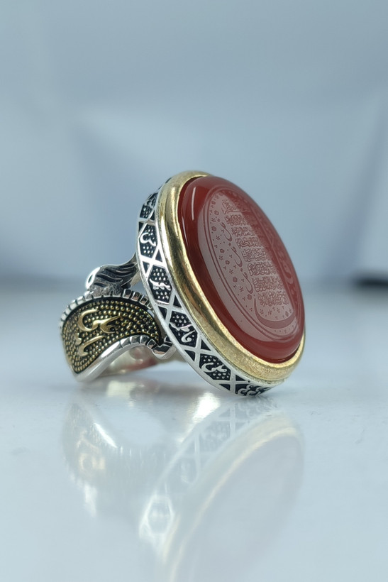 انگشتر نقره مردانه عقیق قرمز حکاکی چهار قل عیار ۹۲۵ دور آیه پنج تن کد ۱۰۱۶