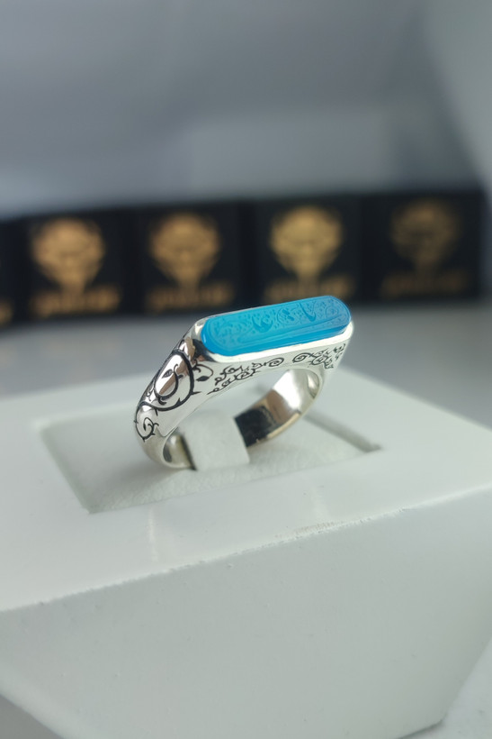 انگشتر نقره مردانه عقیق آبی نیمه دست ساز حکاکی یا علی کد 1029