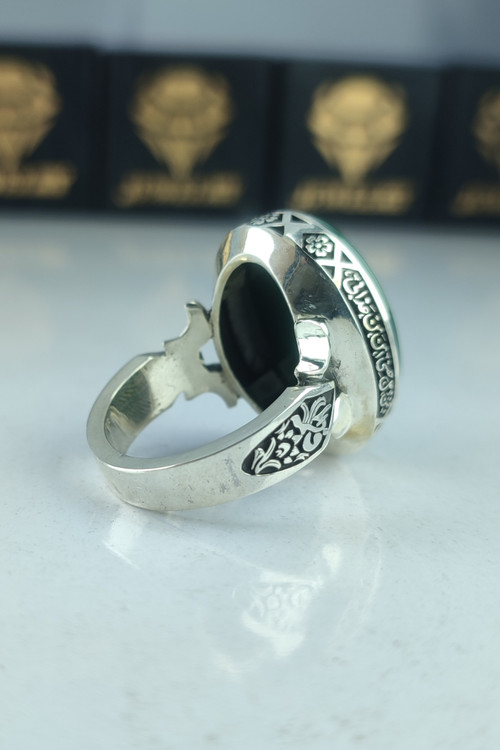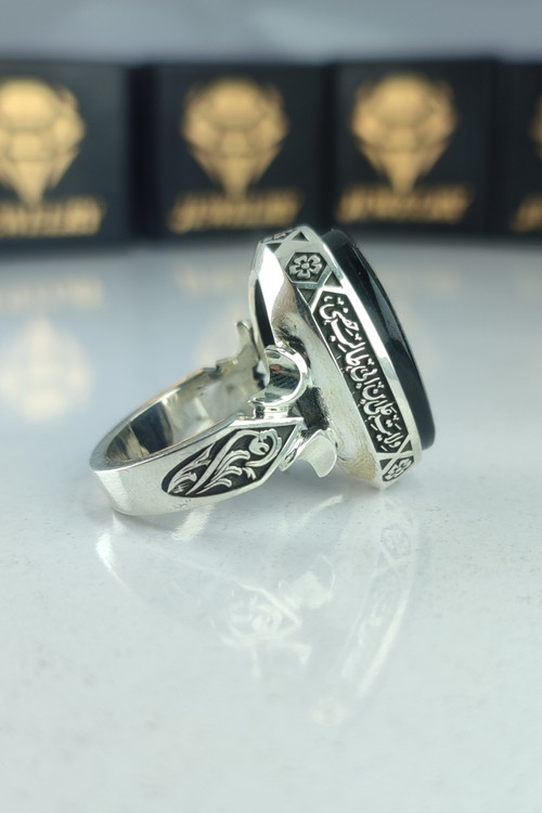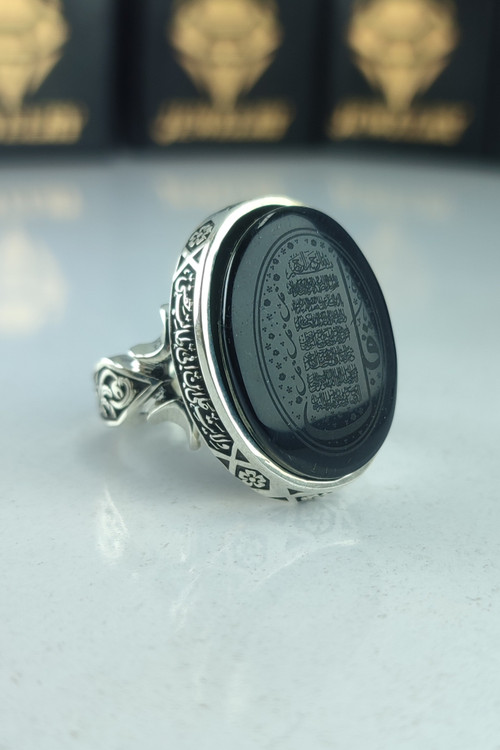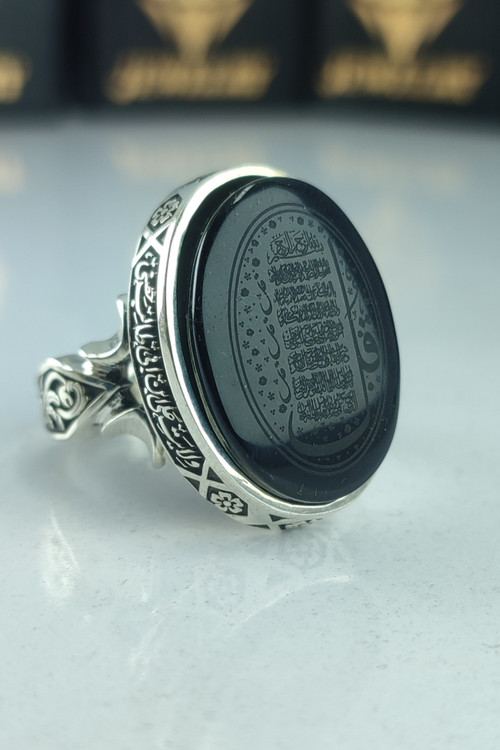 انگشتر نقره مردانه عقیق مشکی حکاکی چهار قل دور آیه ولایة علی ابن ابی طالب حصنی کد 1031
