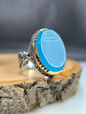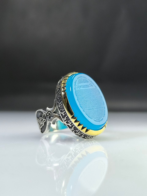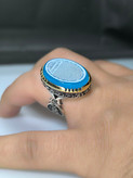 انگشتر نقره مردانه عقیق آبی حکاکی حرز امام جواد (ع) دور آیه ناد علیا کد ۱۰۳۳