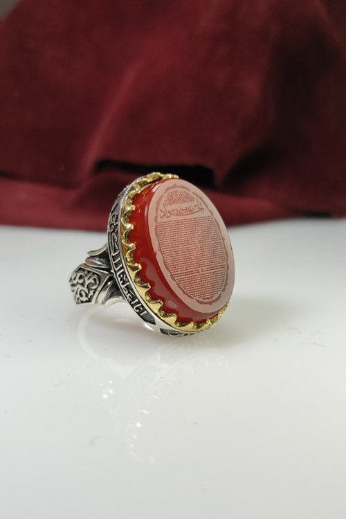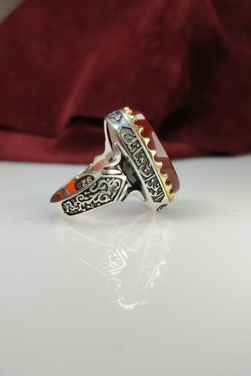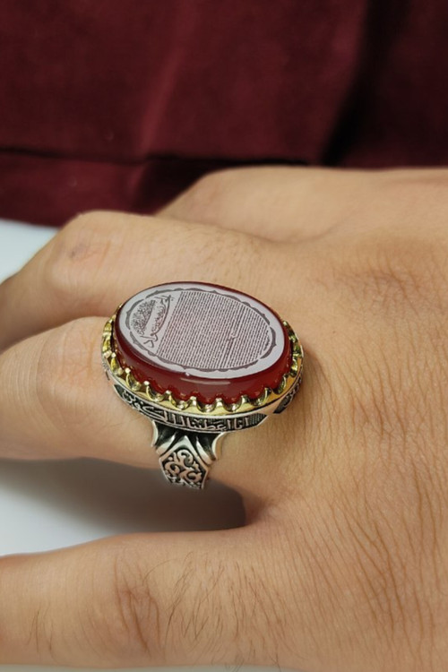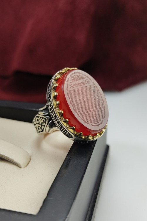 انگشتر نقره مردانه عقیق قرمز حکاکی حرز امام جواد (ع) دور آیه سوره کوثر کد ۱۰۳۴