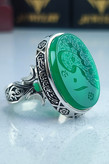 انگشتر نقره مردانه نیمه دستساز عقیق سبز حکاکی حسبی الله دور آیه ولایة علی ابن ابی طالب حصنی کد محصول ۱۰۴۶