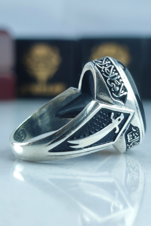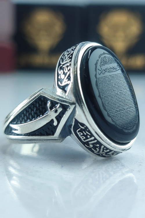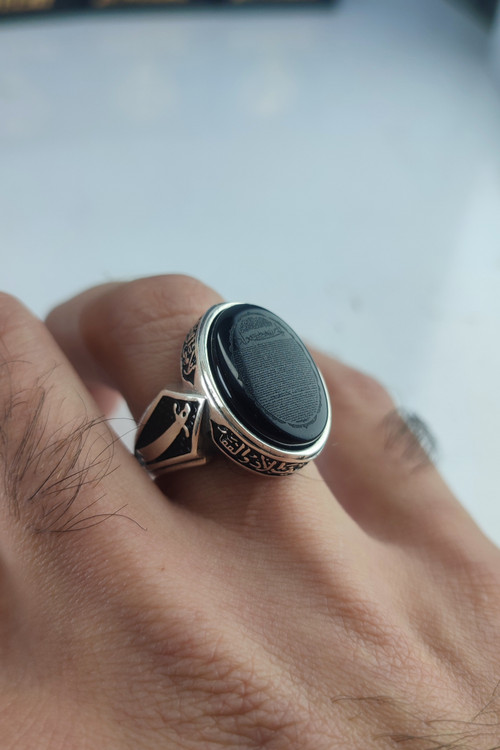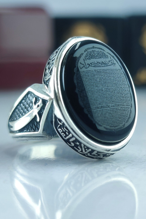 انگشتر نقره مردانه عقیق مشکی حکاکی حرز امام جواد (ع) نقش ذوالفقار دور آیه لا فتی الا علی لا سیف الا ذوالفقار کد ۴۸