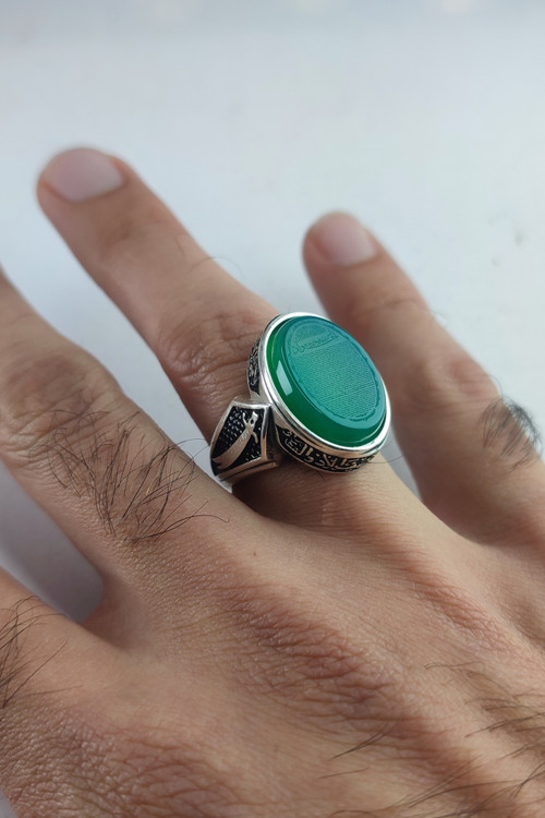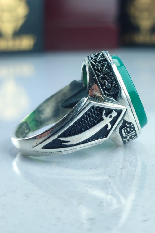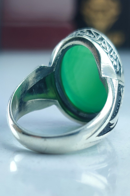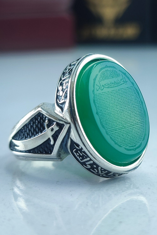 انگشتر نقره مردانه عقیق سبز حکاکی حرز امام جواد (ع) نقش ذوالفقار دور آیه لا فتی الا علی لا سیف الا ذوالفقار کد ۴۹