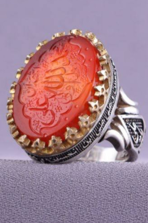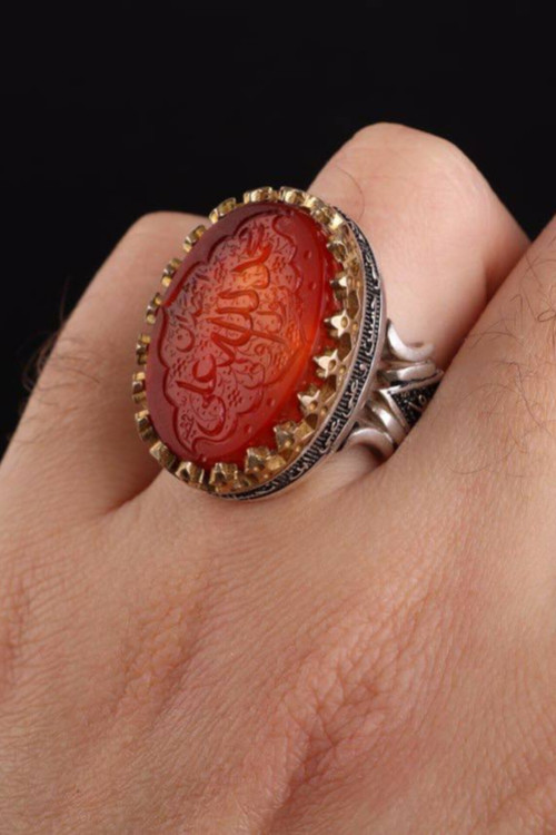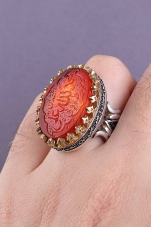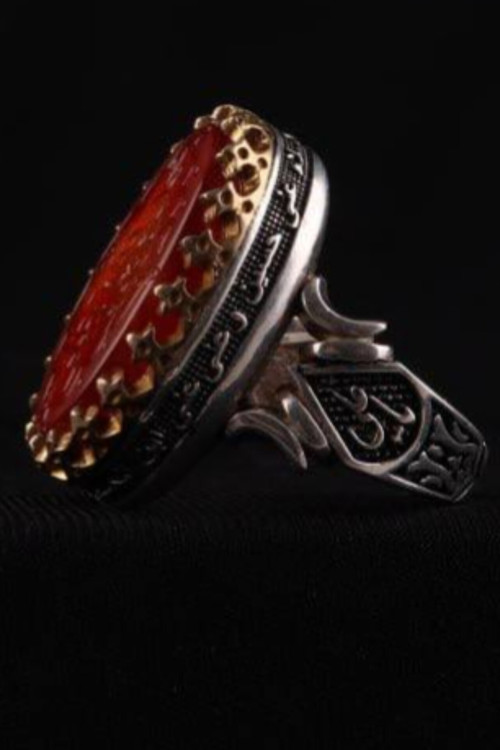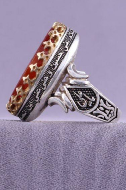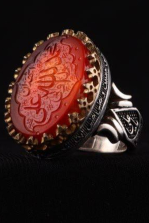 انگشتر نقره مردانه عقیق دو رنگ قرمز حکاکی اشهد ان محمد رسولالله و اشهد ان علی ولی الله دور آیه چهار سلام ابا عبدالله (ع) کد ۱۰۶۲