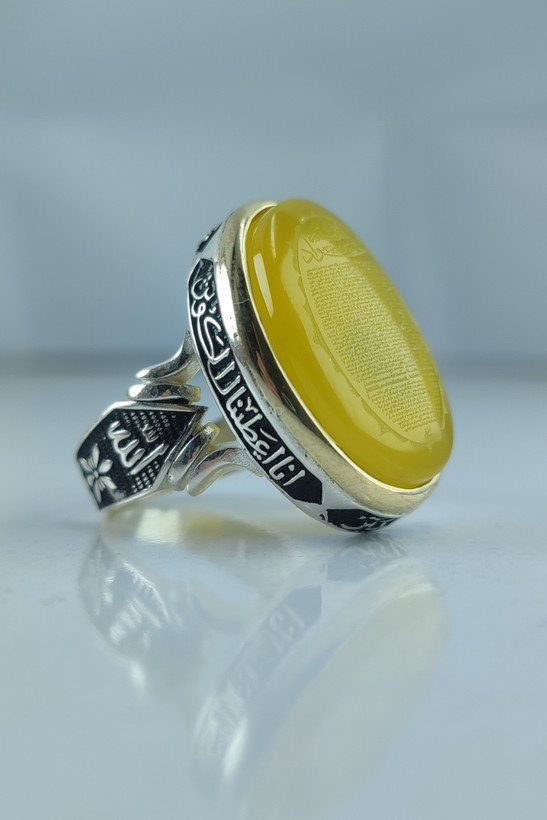 انگشتر نقره مردانه عقیق زرد حرز امام جواد (ع) دور آیه سوره کوثر کد ۱۰۰۸