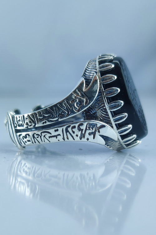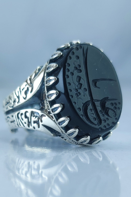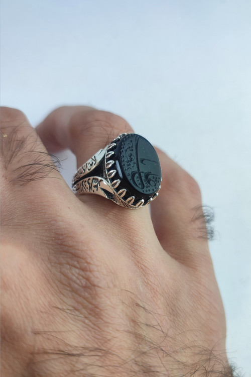 Men's silver ring with open back and engraved black stone or Ali